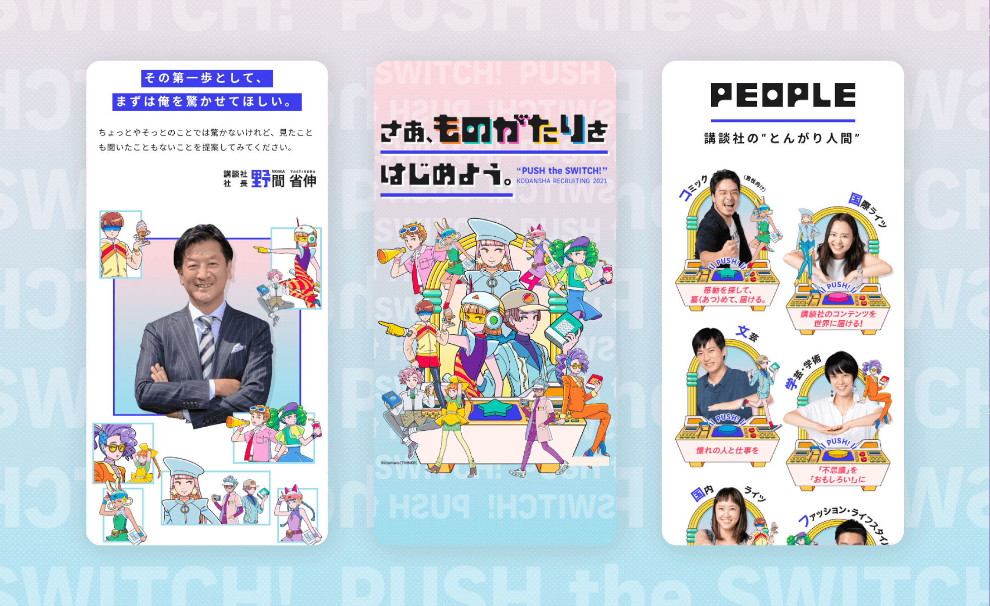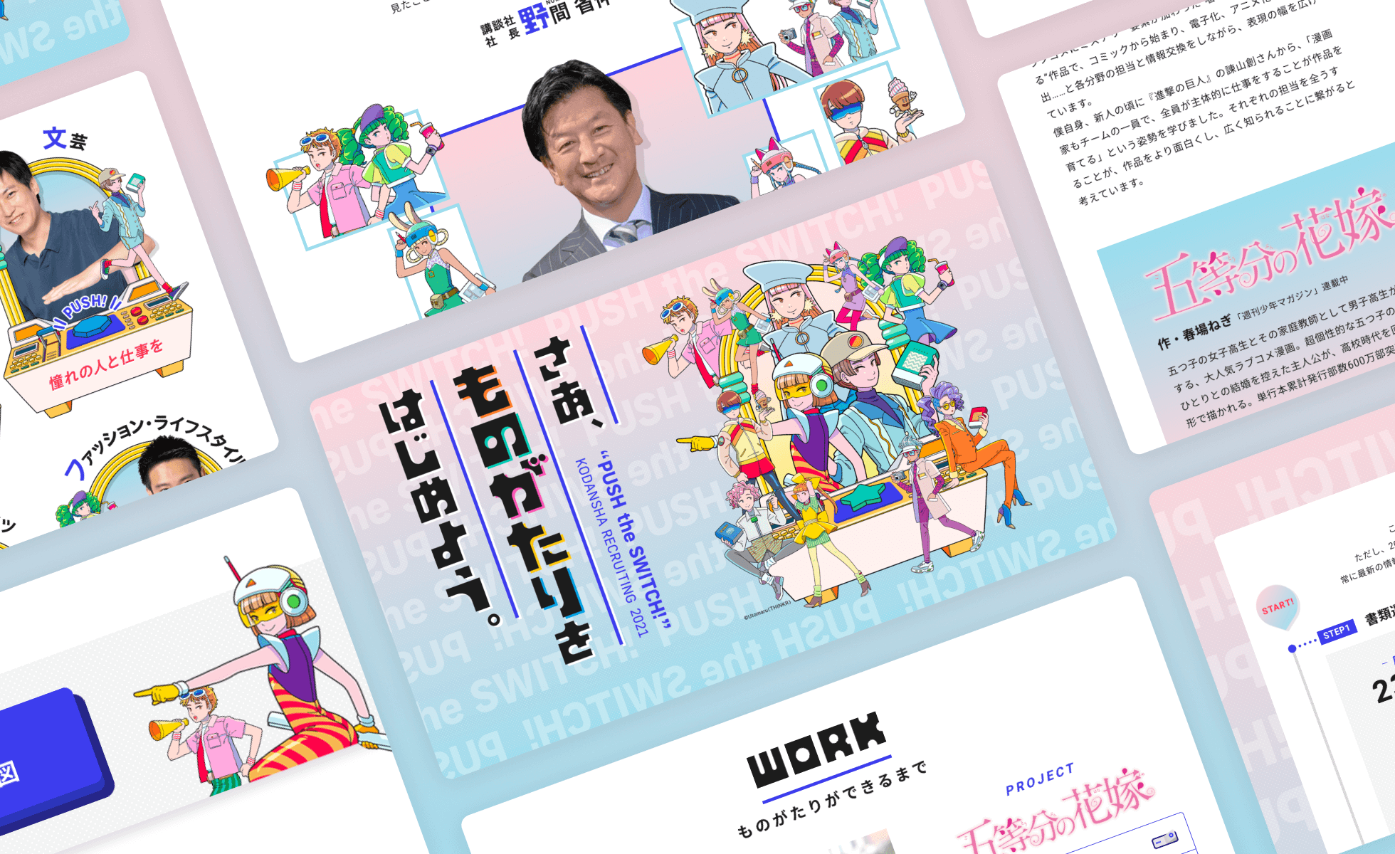 講談社の2021年度入社定期採用サイトを制作。「ものがたり」を生み出す個性豊かな社員をキャラクターのイラストで新規に描き起こし、社員一人ひとりが発想するきっかけを「スイッチ」のモチーフで表現した。 「ものがたり」を生み出すおもしろさへの気づきとして、採用サイトを見て自分の「スイッチ」が押されること、それが自らの「ものがたり」が始まる第1歩になること、それらに共感してもらうことを狙った構成・デザインとした。