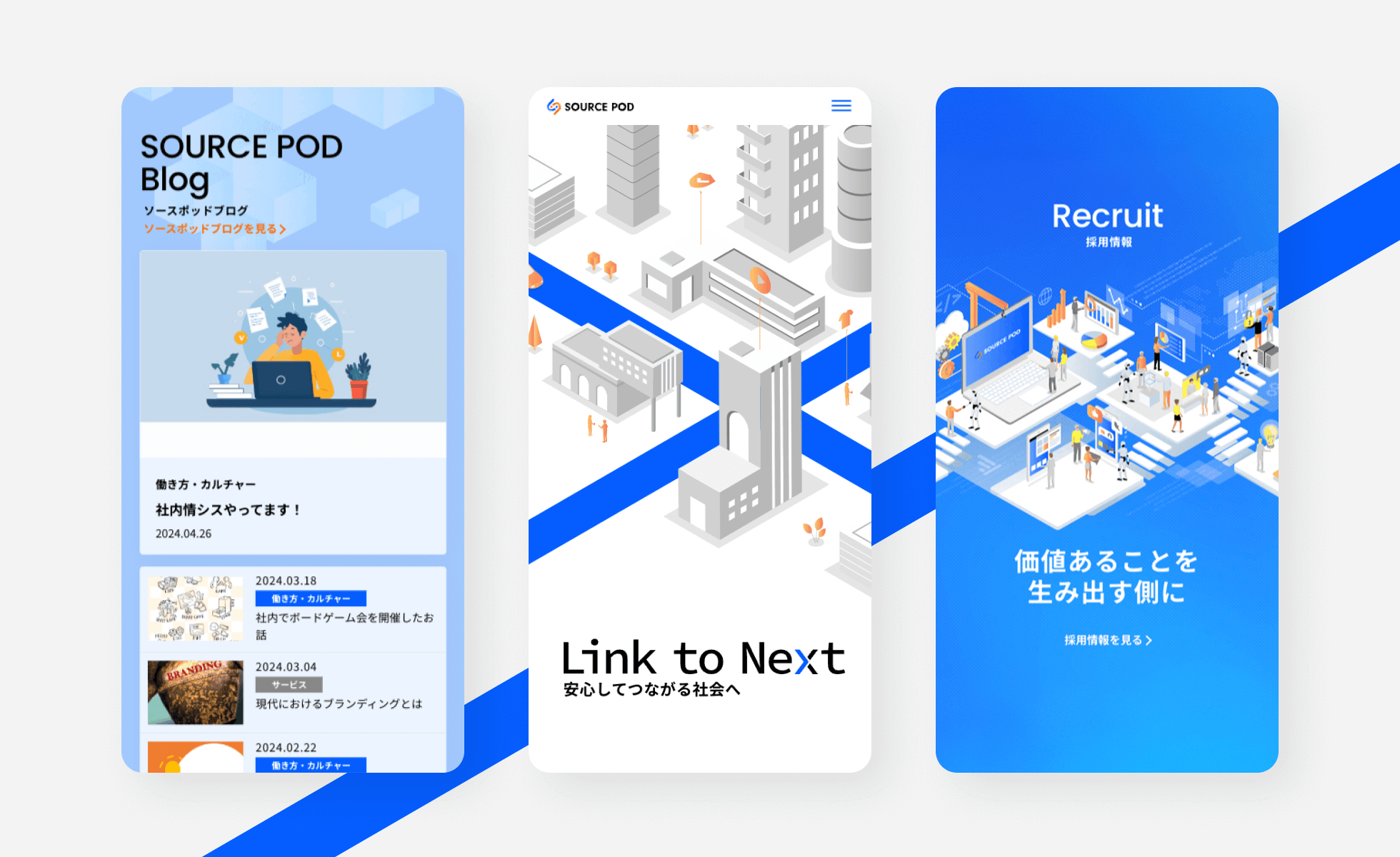 メールセキュリティサービスを提供するソースポッドの企業サイトをMT.netを利用して全面リニューアル。同時に企業のリブランディングを実施し、ロゴマーク、ミッションステートメント、スローガンを新しく策定した。Webに合わせて名刺、会社案内、リモート背景画像、クリアファイル、ノベルティ、紙袋などのアプリケーションツールもトータルで手掛けた。