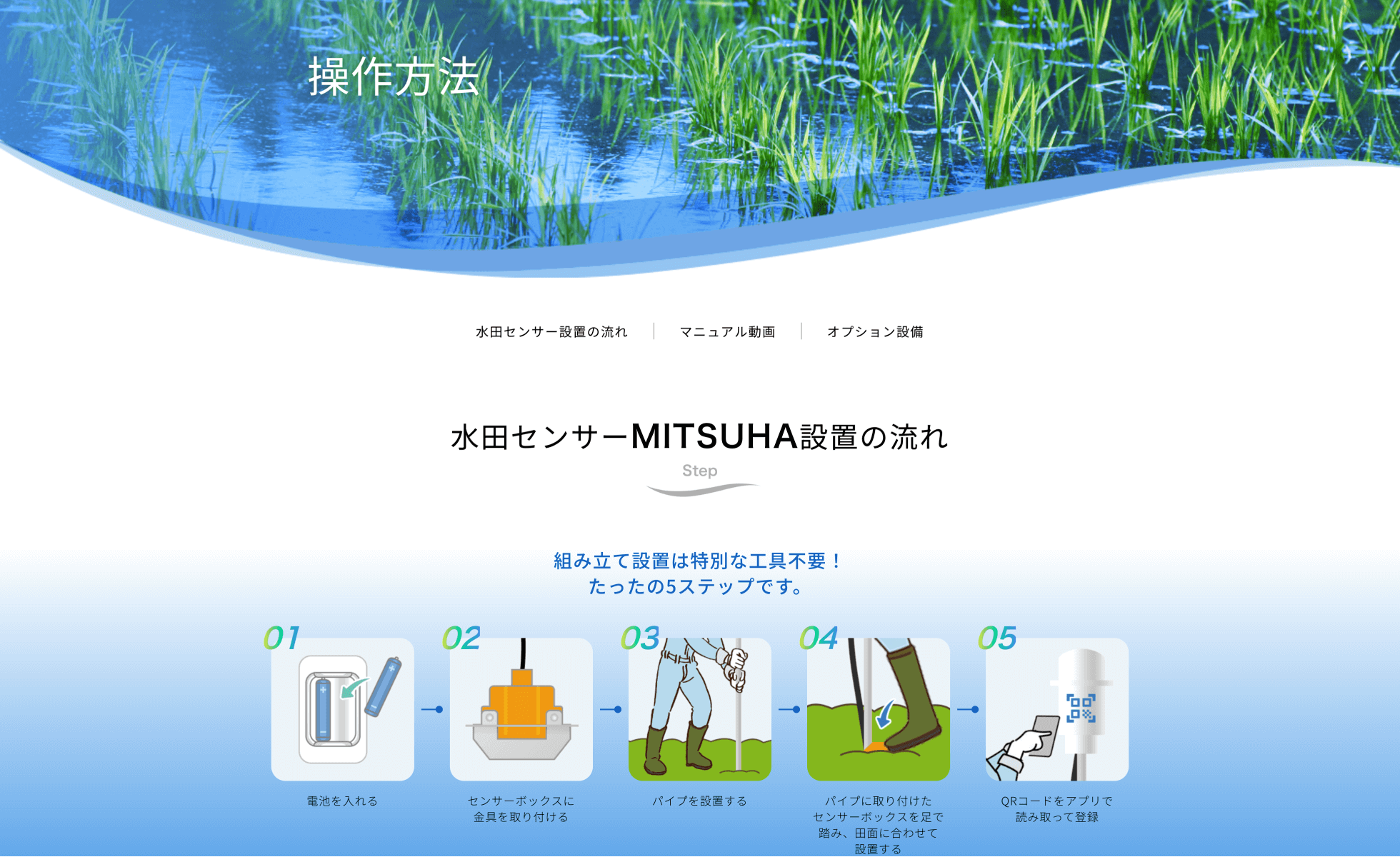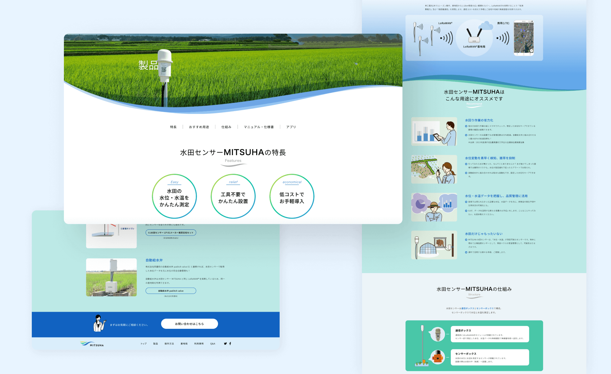 IIJの水管理プラットフォーム MITSUHA のロゴ制作に引き続き、サービスサイトの制作を担当。製品の特長や効果を分かりやすく、理解してもらえるよう挿絵や図版を多用することで、忙しい農家の方々に直感的に認識してもらえるようようにした。A4チラシ、A1パネルも同時に制作。