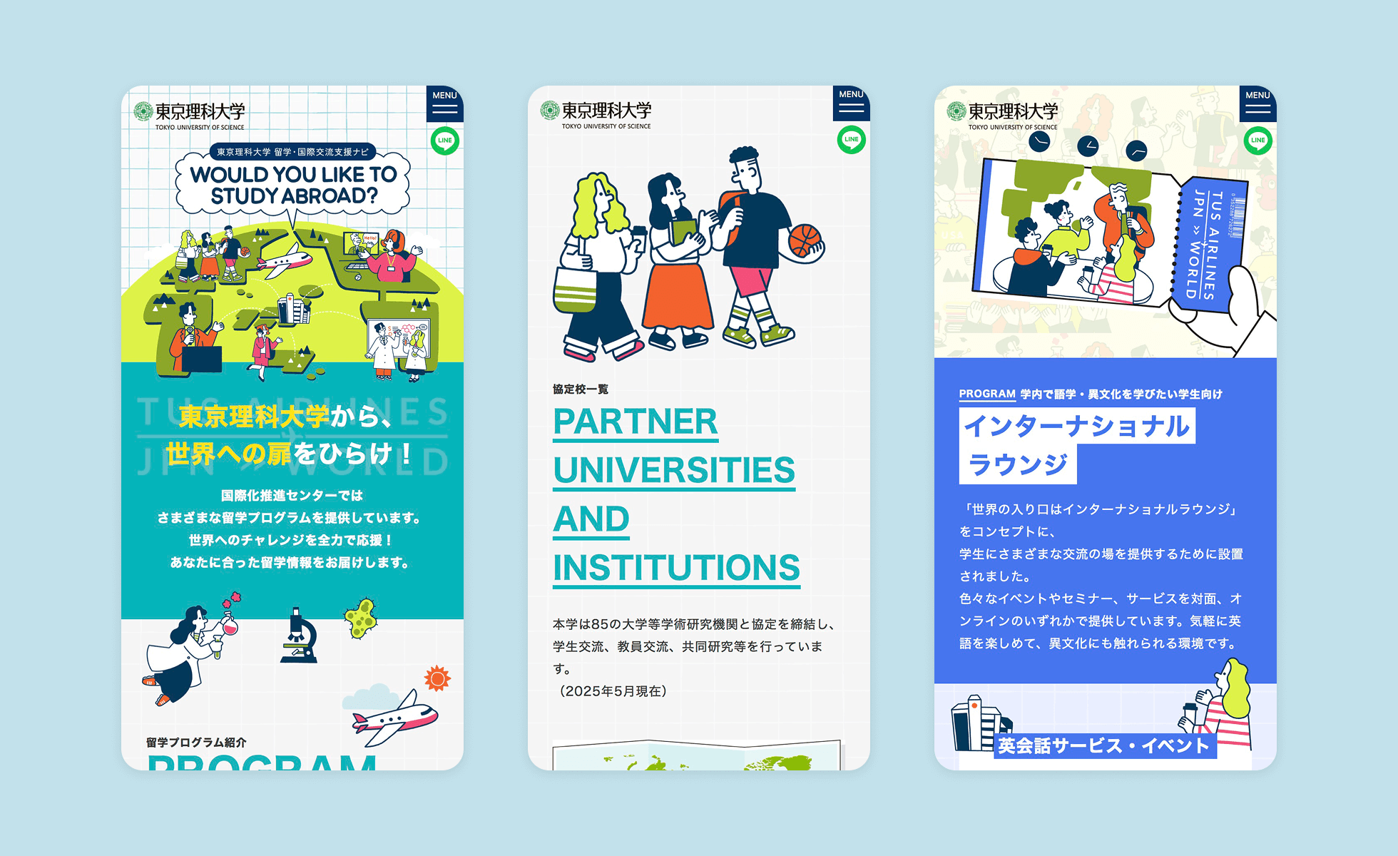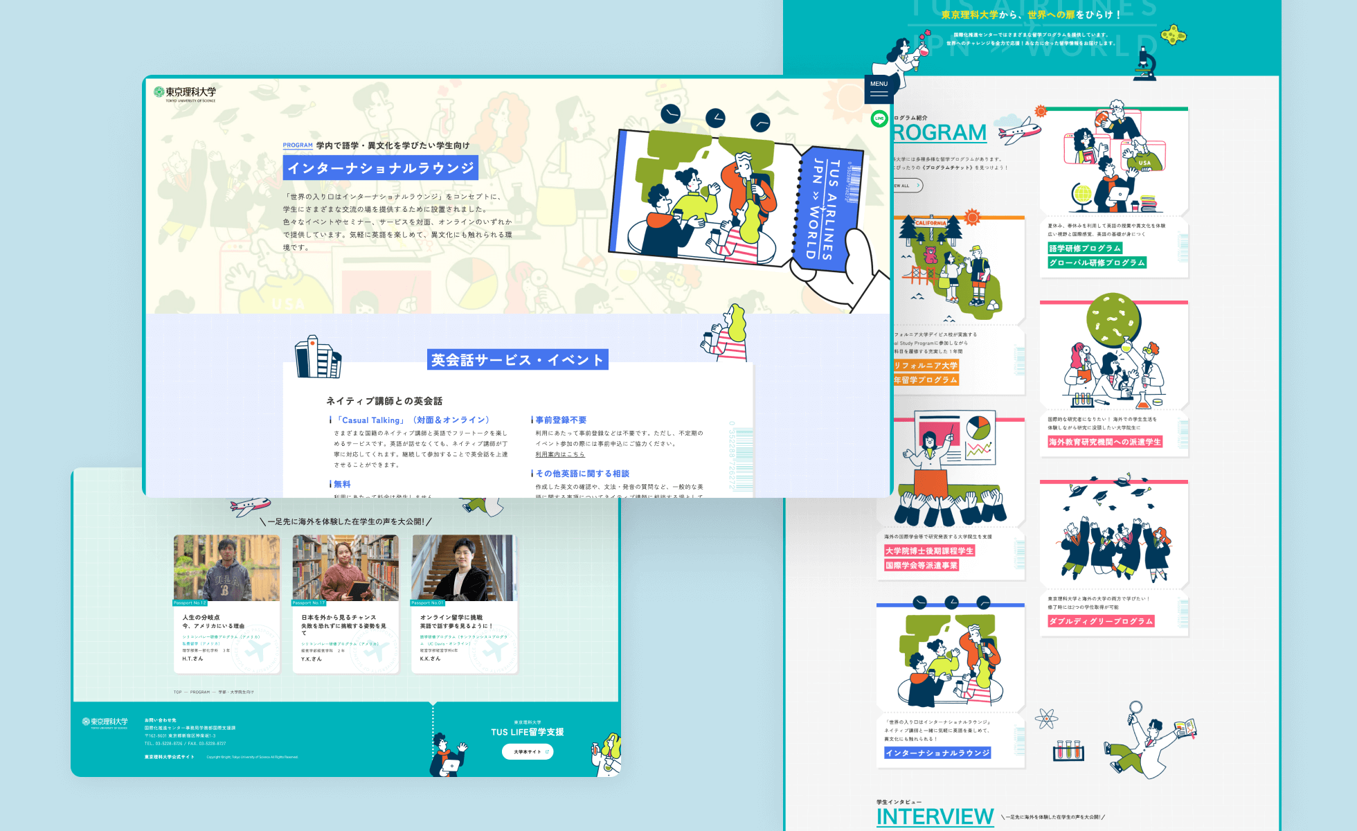 東京理科大学の学生向けに、留学に関する情報伝達サイトを制作。イラストをメインに、世界へ飛び立つ夢と希望を視覚的に表現した。 留学プログラムは将来への「夢チケット」、インタビューは先に世界へ飛び立った先輩たちの「パスポート」をモチーフとし、サイト全体でストーリーを演出。世界を舞台に活躍する夢と希望あふれる、楽しい印象のサイトに仕上げた。構成はシンプルだが、パーツ制作にもこだわり、夢の実現というテーマを細部でも表現している。