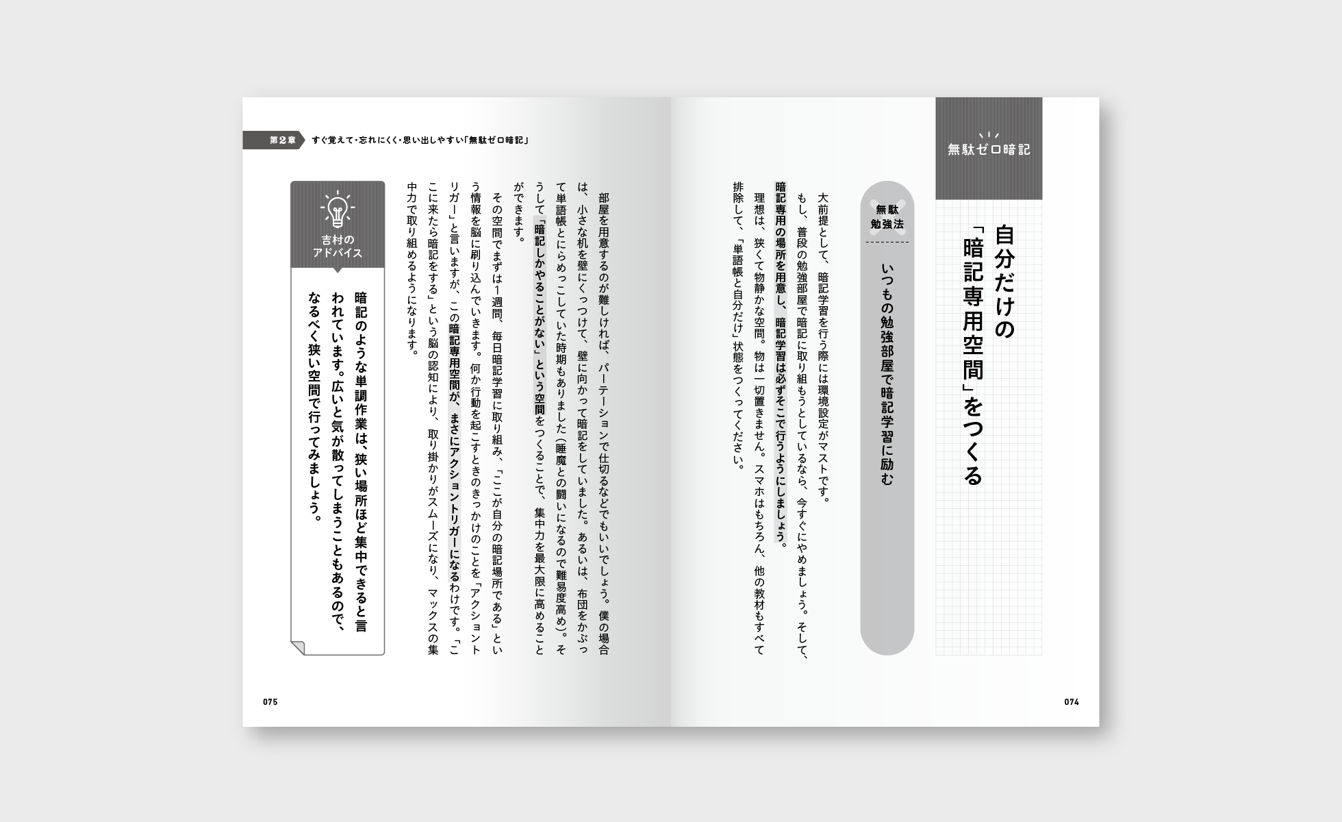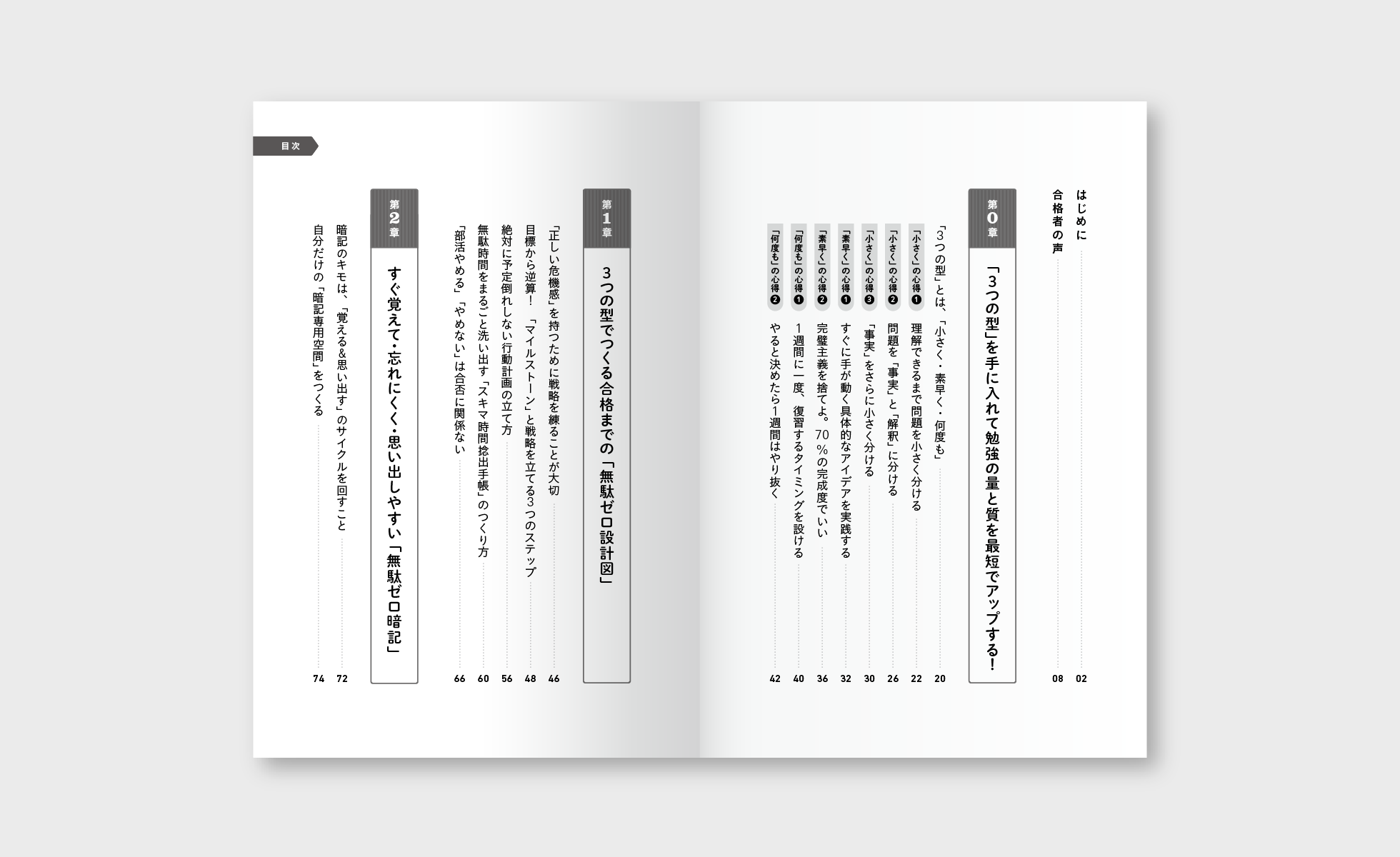 「受験生版Tiger Funding」出演の著者による、「無駄な悩み、頑張りを省く高速学習法」をまとめた一冊。表紙は『無駄ゼロ勉強法』の説得力が視覚的に伝わるような力のあるデザインに。1C印刷の中面は、勉強法のポイントがわかりやすく伝わるように、見出しやまとめのあしらいを工夫し、メリハリのあるデザインに仕上げた。四六判/232P