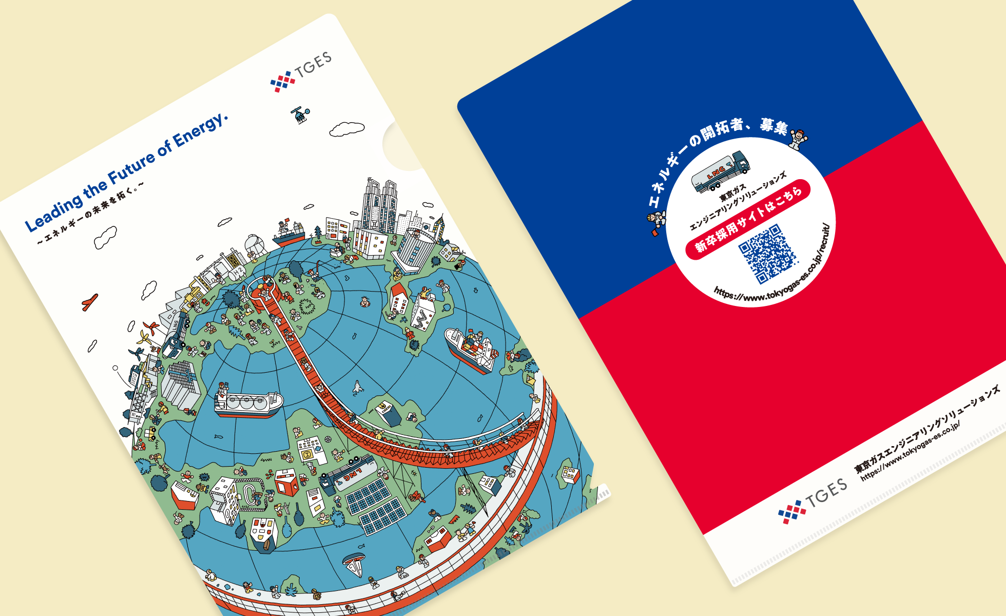 エネルギーに関するエンジニアリングやソリューションをワンストップで提供するTGES(東京ガスエンジニアリングソリューションズ株式会社)の採用ツール制作を担当。イラストをメインにしたクリアファイルとエコバックを作成し、さまざまな分野で展開するTGESの事業を明るく楽しい世界観で表現。クリアファイルの裏面には事業概要から採用サイトへ誘導する仕掛けを施し、トートバックはシンプルなあしらいで普段使いしやすいデザインに仕上げた。