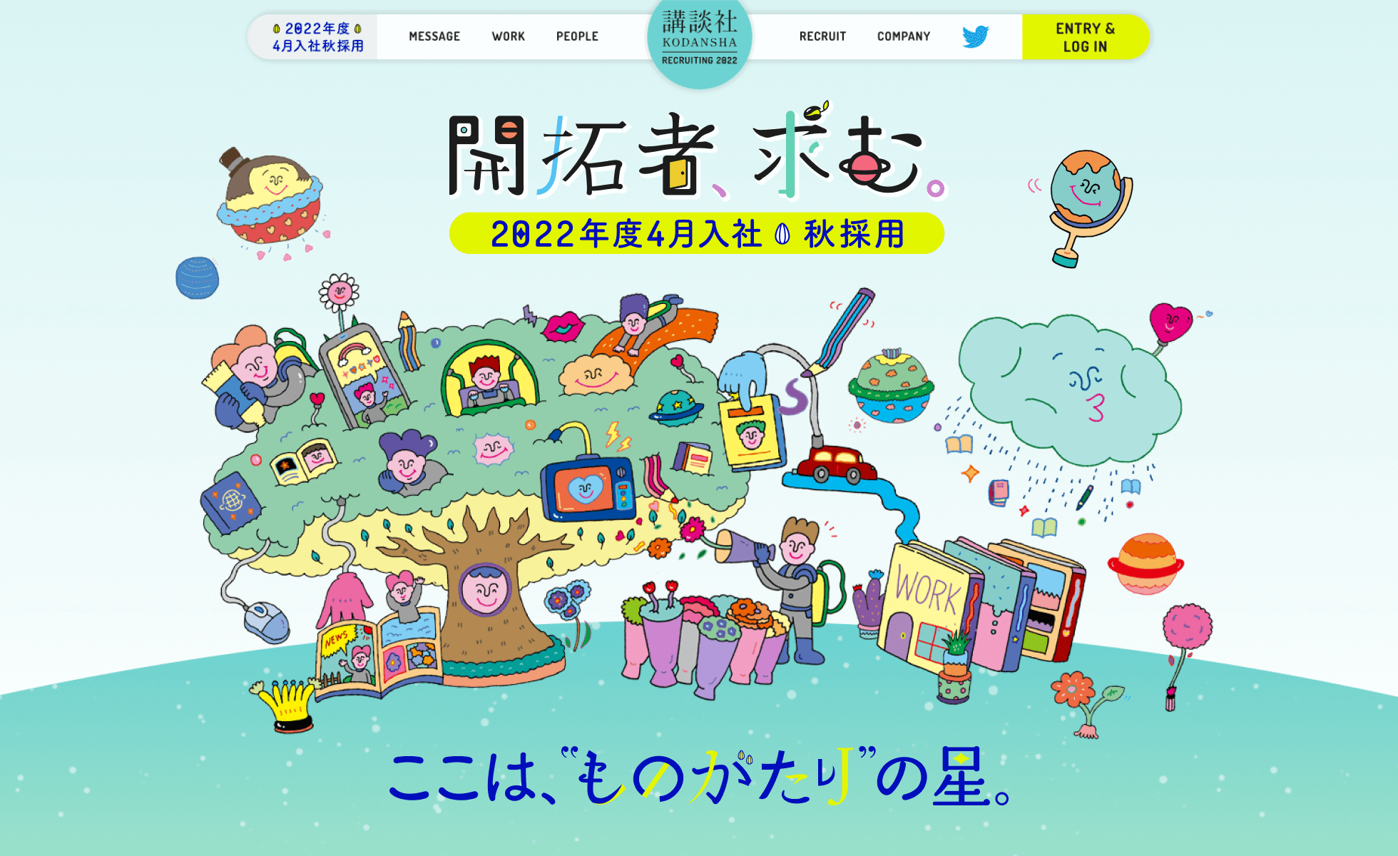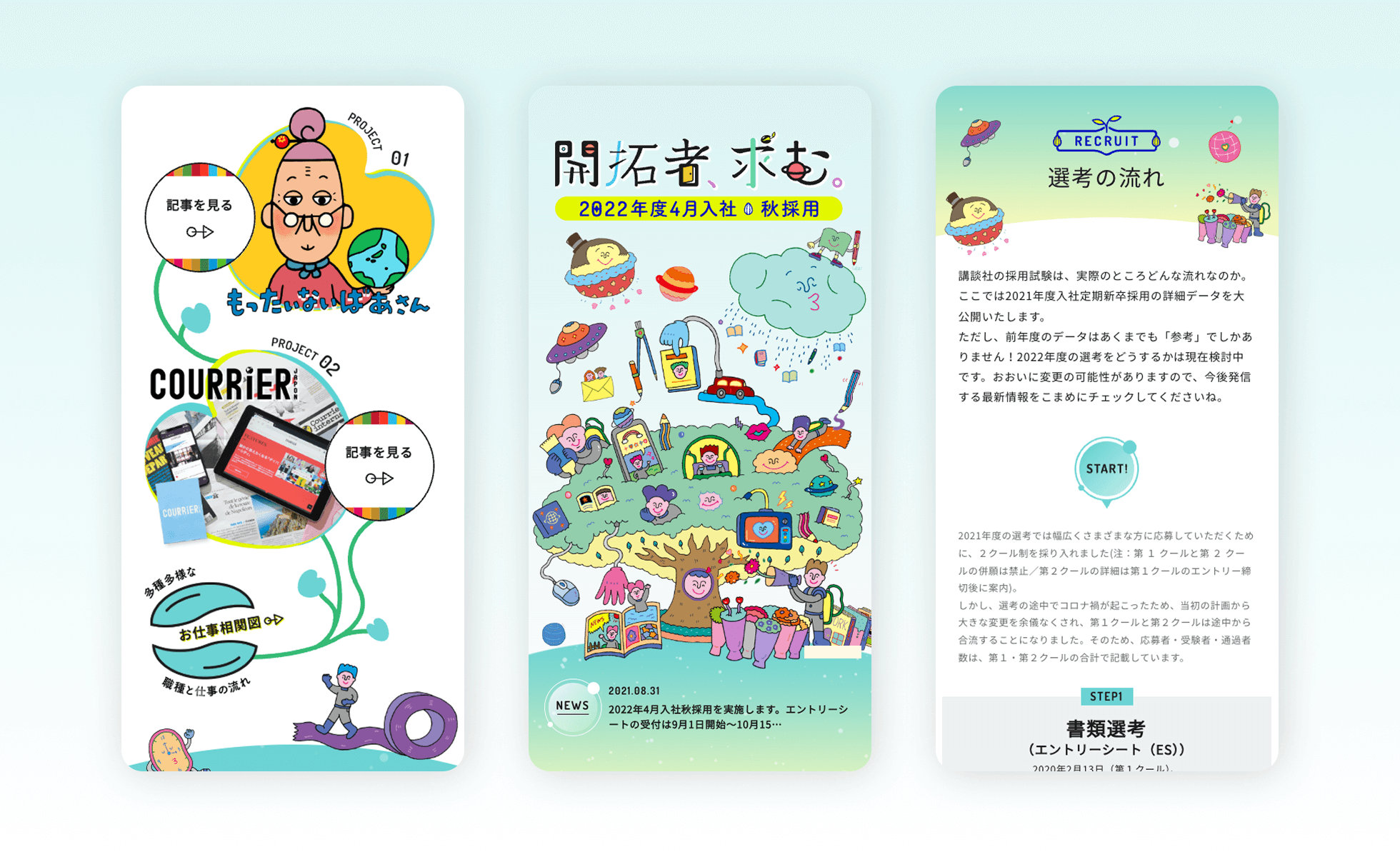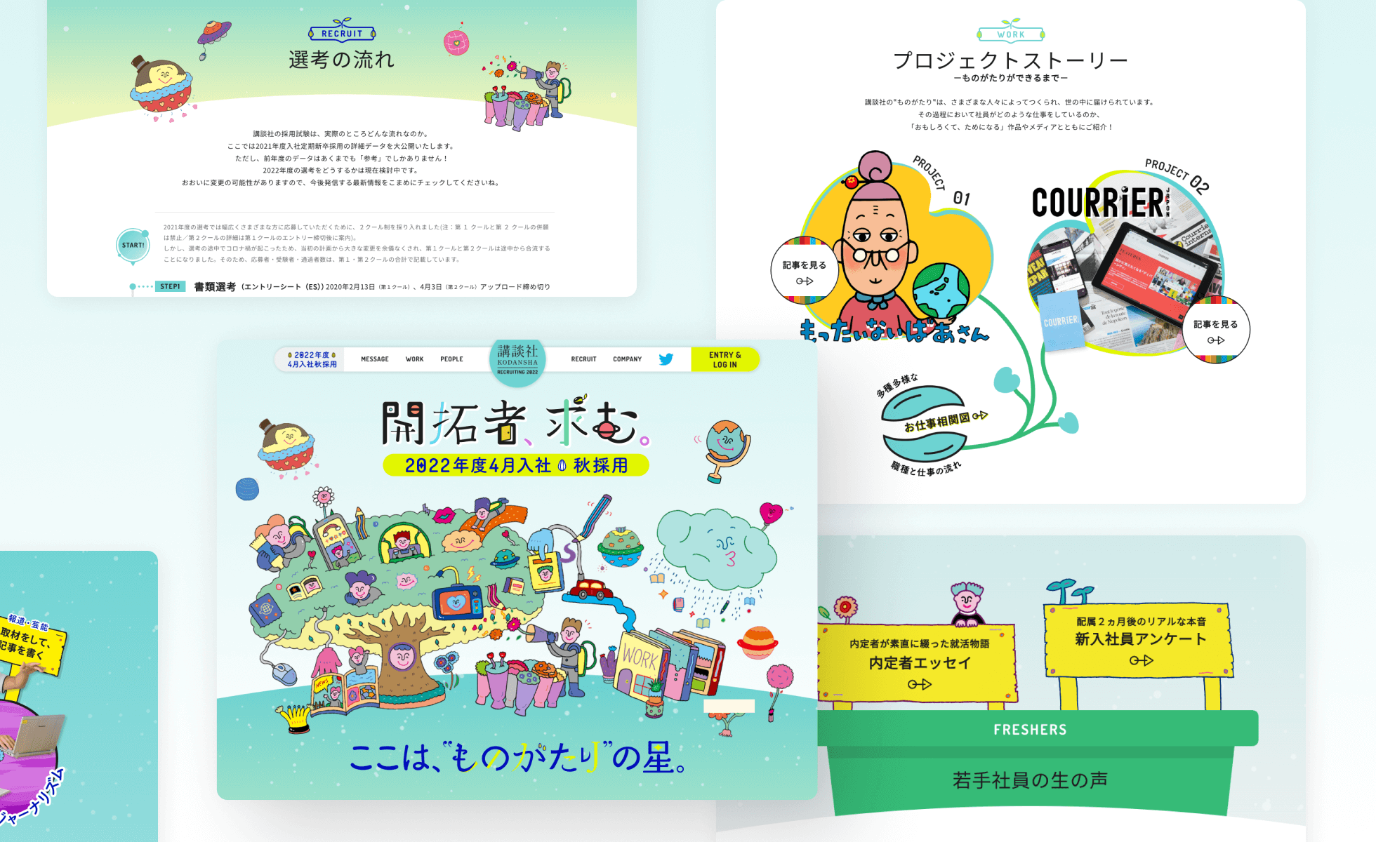 講談社の2022年度入社定期採用サイトを制作。「ものがたりの星」をテーマに、多種多様なものがたりの種を見つけ、育ていく様子をユニークなイラストで表現。明るく希望に満ち溢れるようなデザインを目指した。