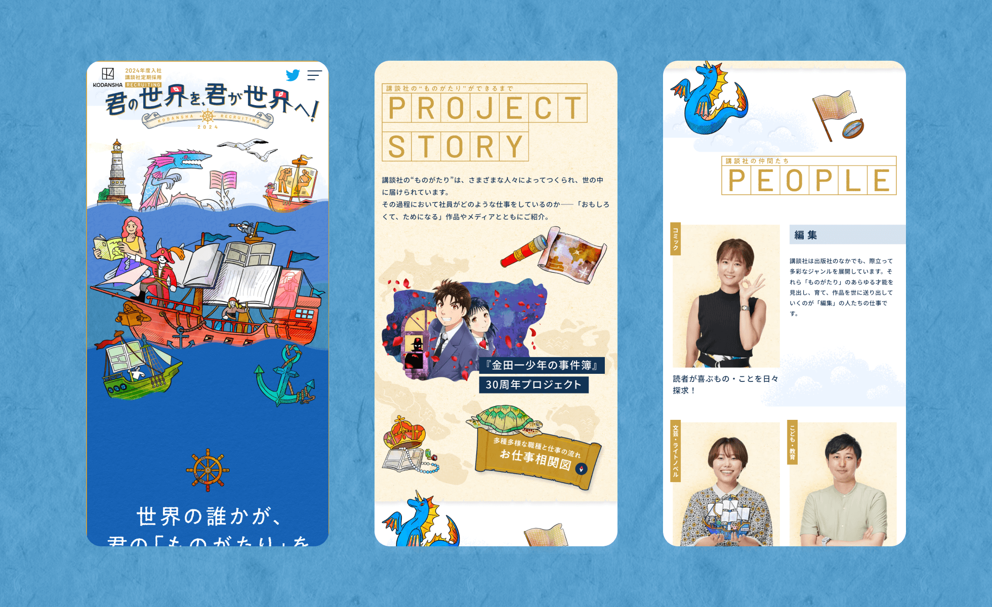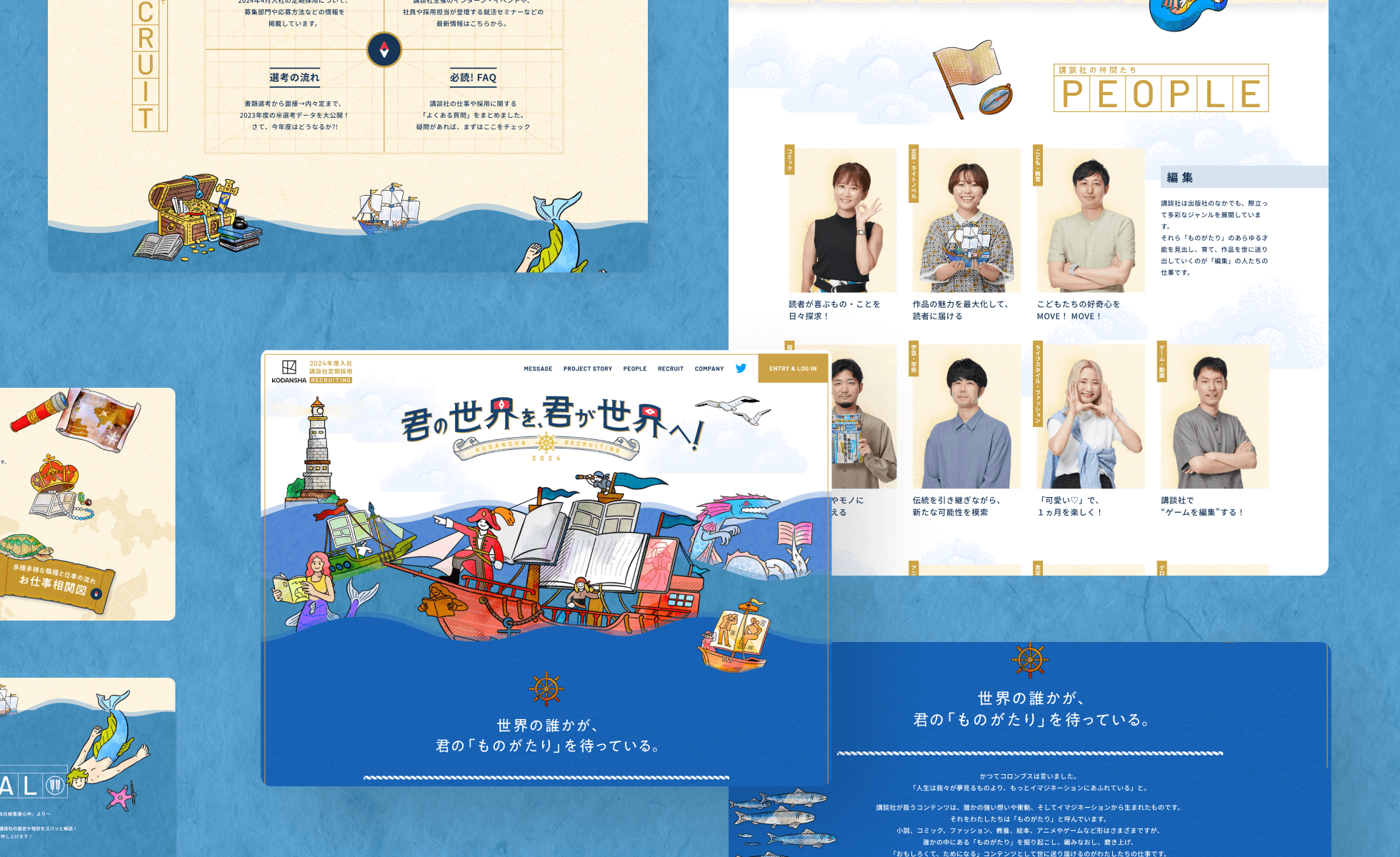 講談社の2024年度入社定期採用サイトを制作。今年度の採用メッセージは「世界に広がるものがたり」として、大航海時代をテーマに「君の世界を、君が世界へ!」を掲げている。様々な海の生き物をイラストで表現することで、多様な個性が集まってものがたりの海をつくるという世界観をサイト全体でつくりあげ、学生が自分の世界を描き、夢を広げたいとワクワクするようなサイトに仕上げた。
