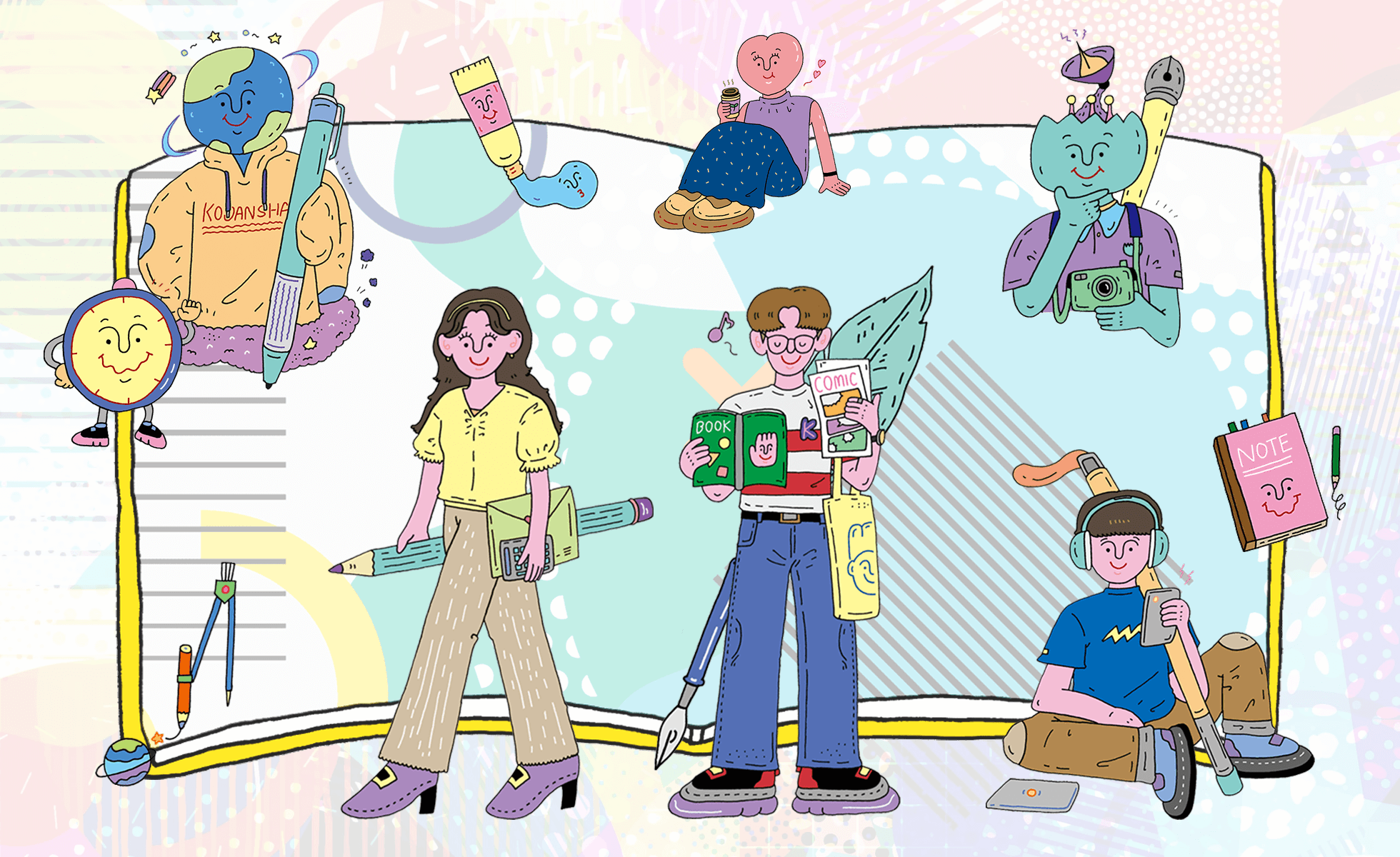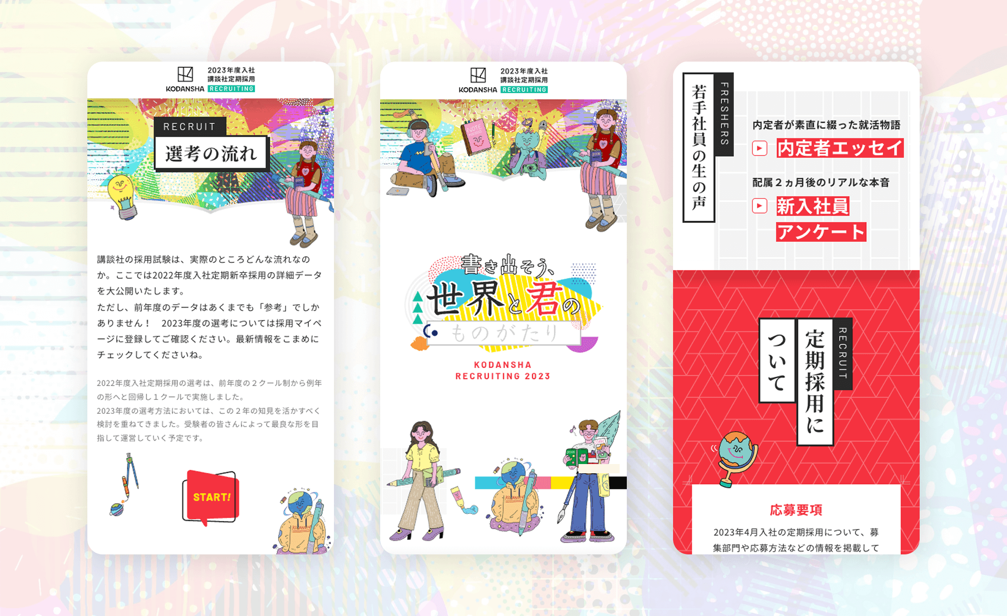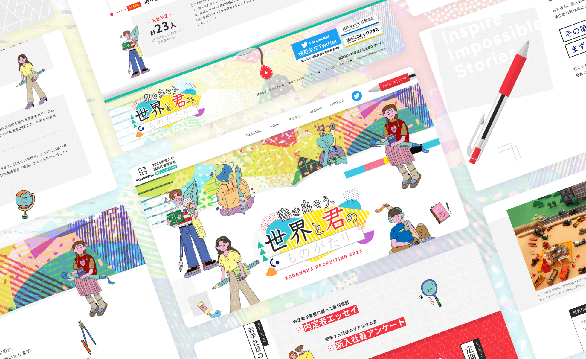 講談社の2023年度入社定期採用サイトを制作。今年度は「本」「ものがたりをつ くる」「多様性」のキーワードをテーマに「書き出そう、世界と君のものがたり。」を採用メッセージに掲げている。ものがたりを描くペンをモチーフに、個性あふれる人物をイラストで表現。学生が自分のものがたりを描き、楽しく働いてみたい、ワクワクする気持ちを視覚的に伝達することを目指した。