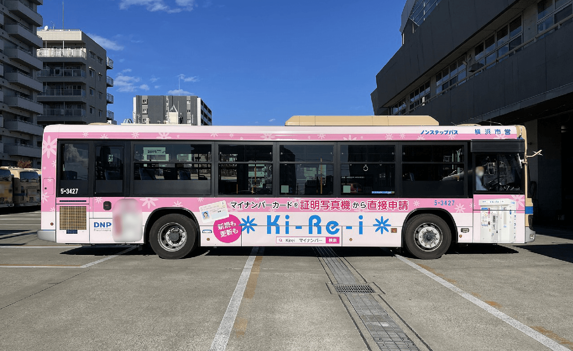 マイナンバーカードの直接申請機能を訴求する証明写真機のバスラッピング広告をデザイン。街を歩く人の目を引く鮮やかなブランドカラーをベースに、伝えたい情報をバランスよく配置した。公共性の高い媒体であることを考慮し、視認性と信頼感の両立を工夫。バスの形状を活かし、どの角度からも視認性が高いレイアウトを実現した。