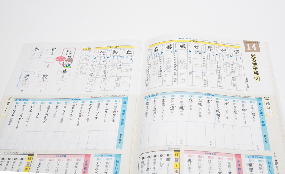 「忘れたころに覚え直す!」をコンセプトに制作された中学生向けの国語副教材。3学年すべての装丁、ページフォーマットを担当。手書き文字やアースカラーを用いることで、賑やさや楽しさを感じながらも学習の邪魔にならないデザインを心掛けた。B5/96P