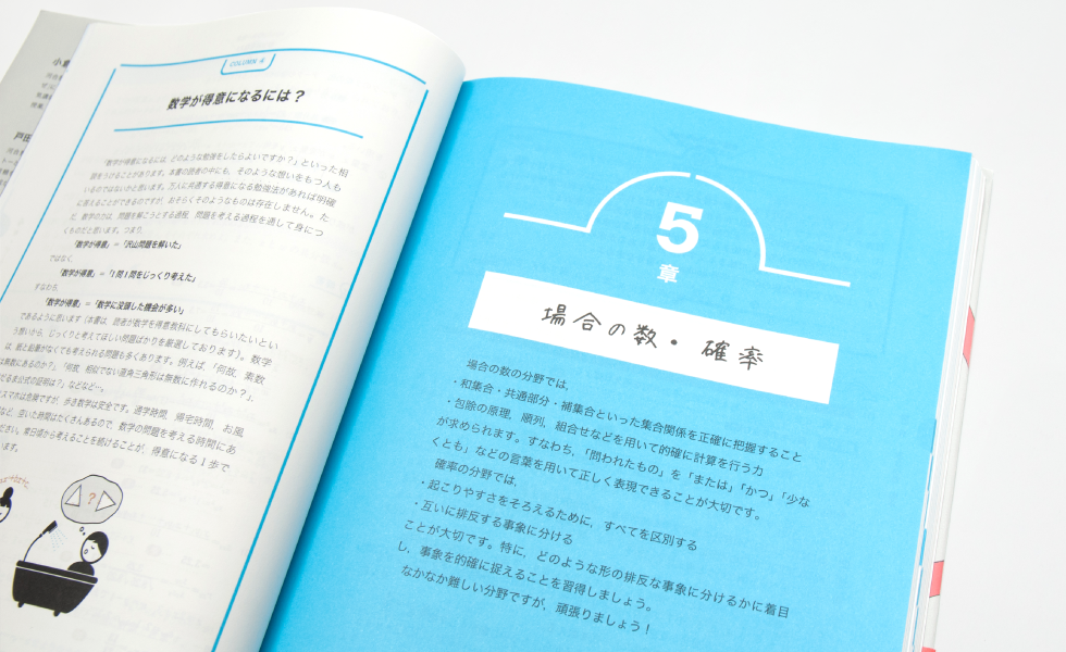 どのように書けば部分点がもらえるのか、採点基準がわかる解答解説付きの問題集。数学ⅠA・ⅡBと数学Ⅲの2冊に分かれており、数学を想起させる記号や図形を散りばめたインパクトのあるイラストを使用。本を開いた状態で並べると、イラストが繋がるように工夫したところがポイント。B5判