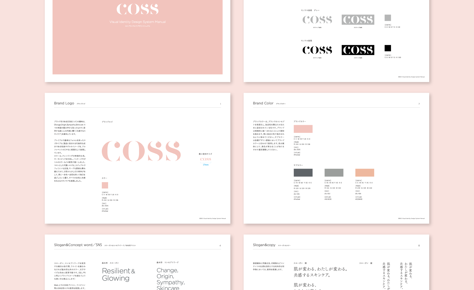 スキンケアブランド「COSS」のコンサルティングおよびプランニング、新規ブランド開発。自然界にある粘液ゲルを利用したプロダクトのコンセプト立案、ネーミング、スローガン開発、ロゴ、ボトル、パッケージデザインなどのブランド全般のクリエイティブに加え、撮影、リーフレット制作、取材ライティングなどを含む販促物の制作から、オンラインストア構築までをワンストップで手掛けた。 ブランドスローガンは「肌が変わる、わたしが変わる。共感するスキンケア」。
