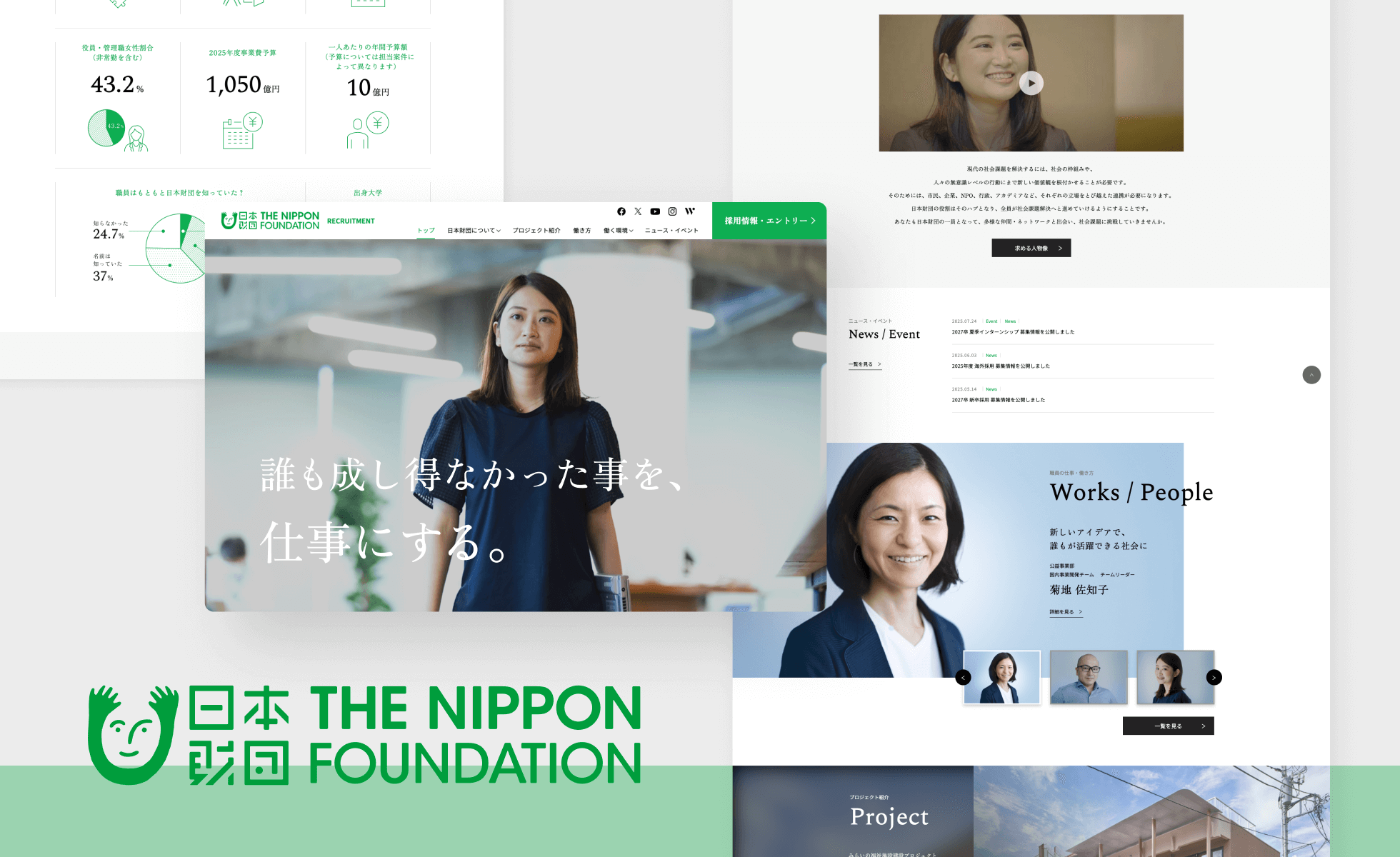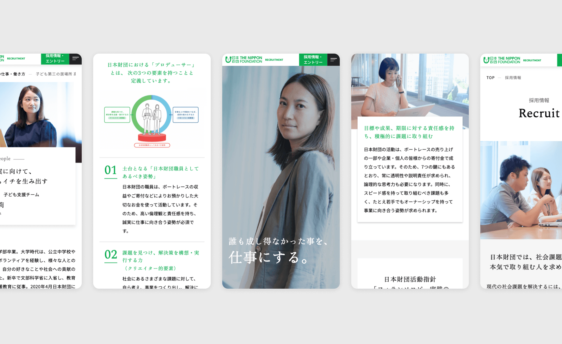 日本最大規模の公益財団法人である日本財団の採用サイトのデザインとコーディングを担当。これまでの、社会貢献やボランティアのイメージを一新し、社会課題の発見と解決に取り組む集団としてのプロフェッショナル性を感じさせるトーン&マナーのデザインに仕上げた。