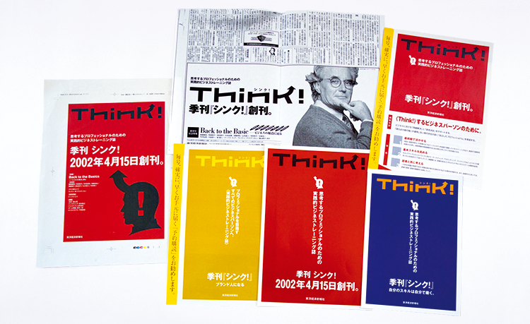 東洋経済新報社が発行するビジネス誌「Think!」のエディトリアルデザイン。A4変形 4C/2C 毎号200ページを1冊丸ごと担当した。創刊時にはタイトルロゴを開発し、 その他パンフレットや新聞広告、垂れ幕、チラシ等、各種ツールも制作。