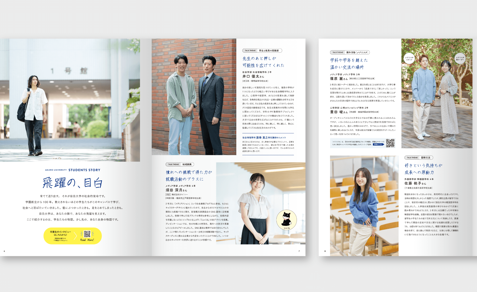 2024年度版に続き、目白大学の受験性向け大学案内の制作を担当。全体の構成やデザインのトーン&マナーの設計、撮影ディレクション、イラストのディレクションなど、コンテンツ設計からビジュアルマネジメントまでトータルでデザインディレクションを行った。前年度版の方針を引継ぎ、各学部・学科の学びや特徴をわかりやすく訴求するとともに、掲載コンテンツをアップデート。学生の時間割&バッグの中身紹介、大学にまつわるトピックス紹介など、学業以外にも受験生が読んで楽しめる企画を多数取り入れ、大学への興味・関心に繋がる一冊を目指した。