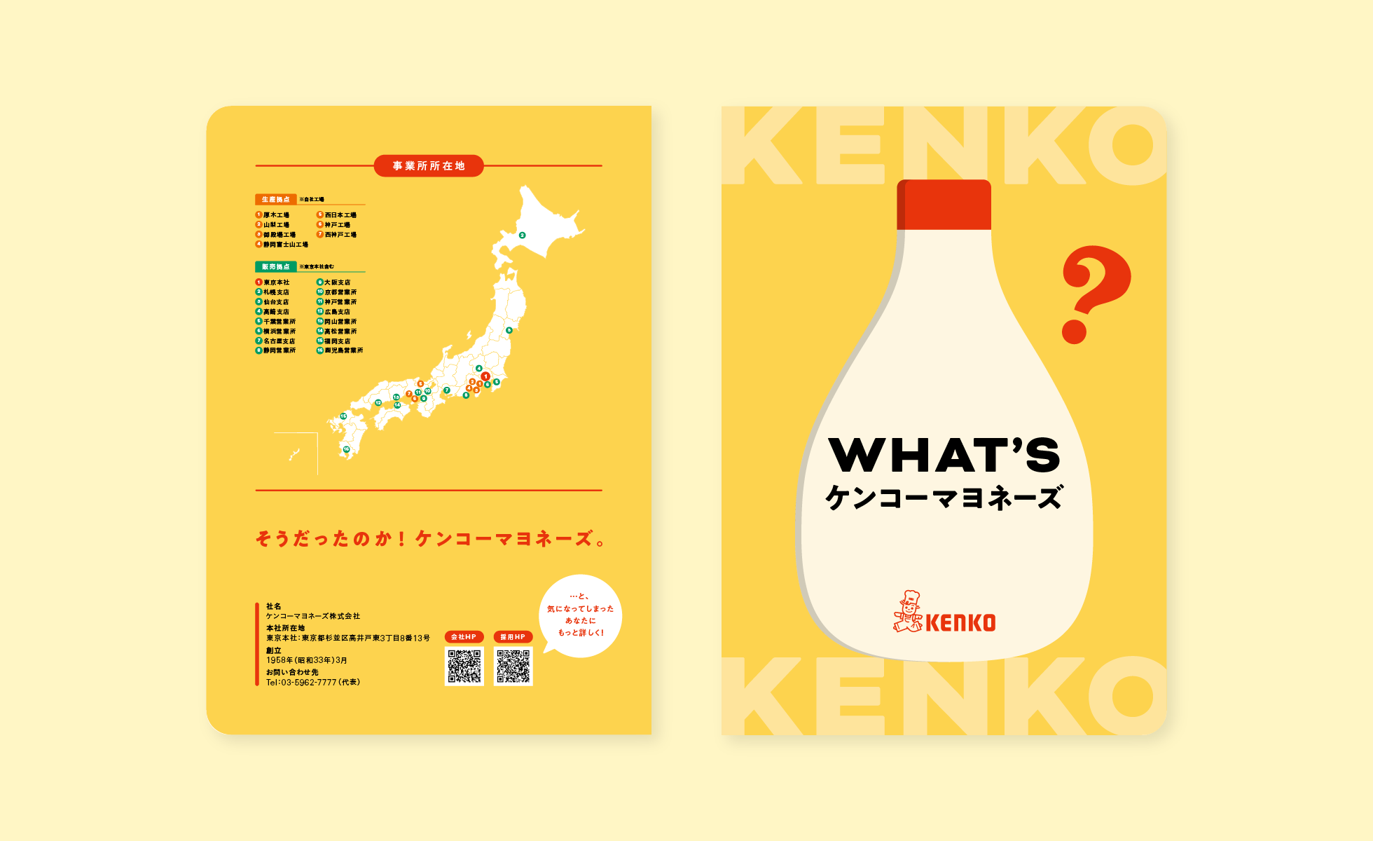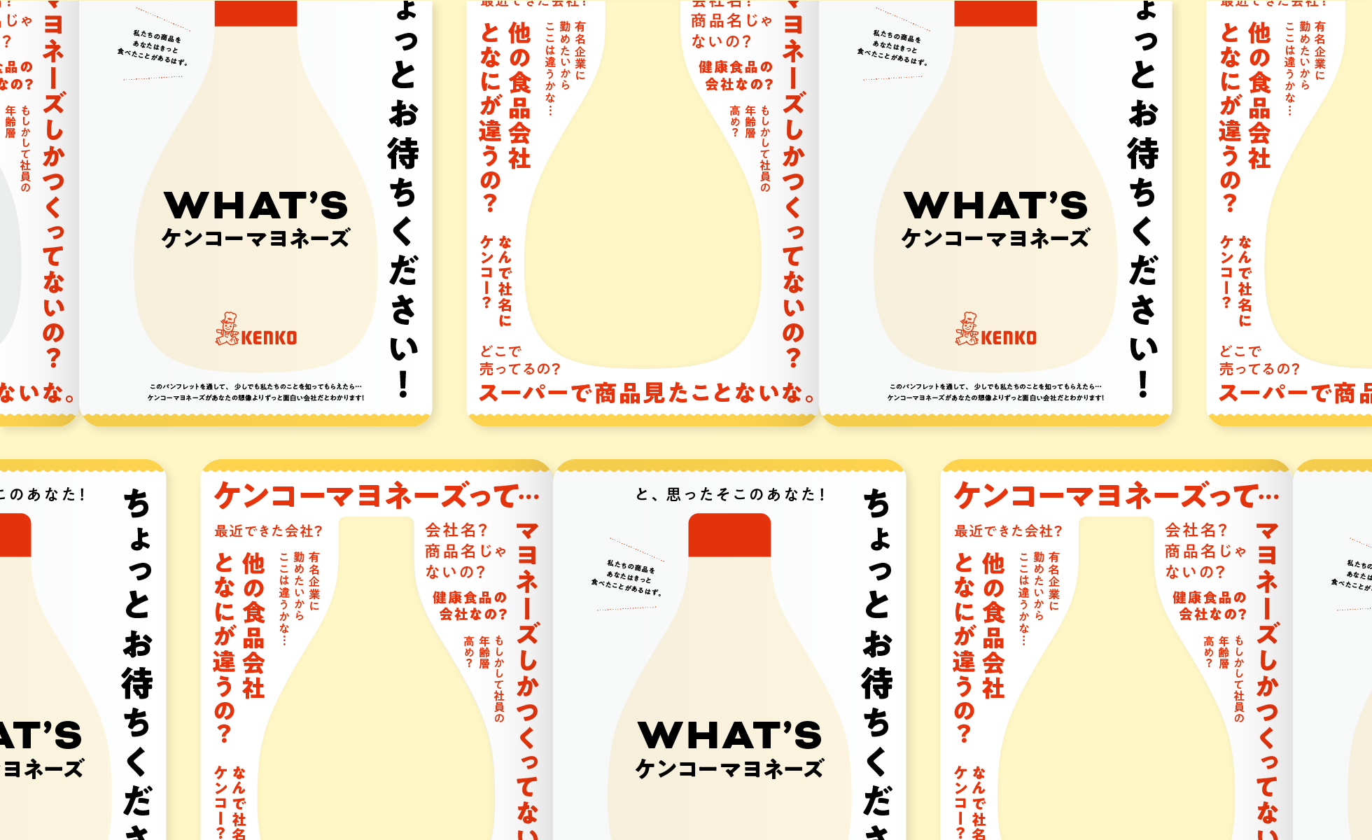業務用のマヨネーズやドレッシング、サラダ・総菜、タマゴ加工品などを製造販売する食品会社の採用案内を制作。採用活動初期で使用するツールとして「印象にのこる」ために、学生からのよくある勘違いや本音を、ユーモアたっぷりなQ&A方式で紹介する、一味違う採用パンフレットになっており、デザインもインパクトと遊び心を意識したビジュアルに仕上げた。表紙はマヨネーズの形に型抜きすることで、開いた瞬間に驚きと楽しさを感じられるような仕掛けを施している。パンフレットのデザインにあわせて、採用イベントで使用する展示ツールの制作も担当。