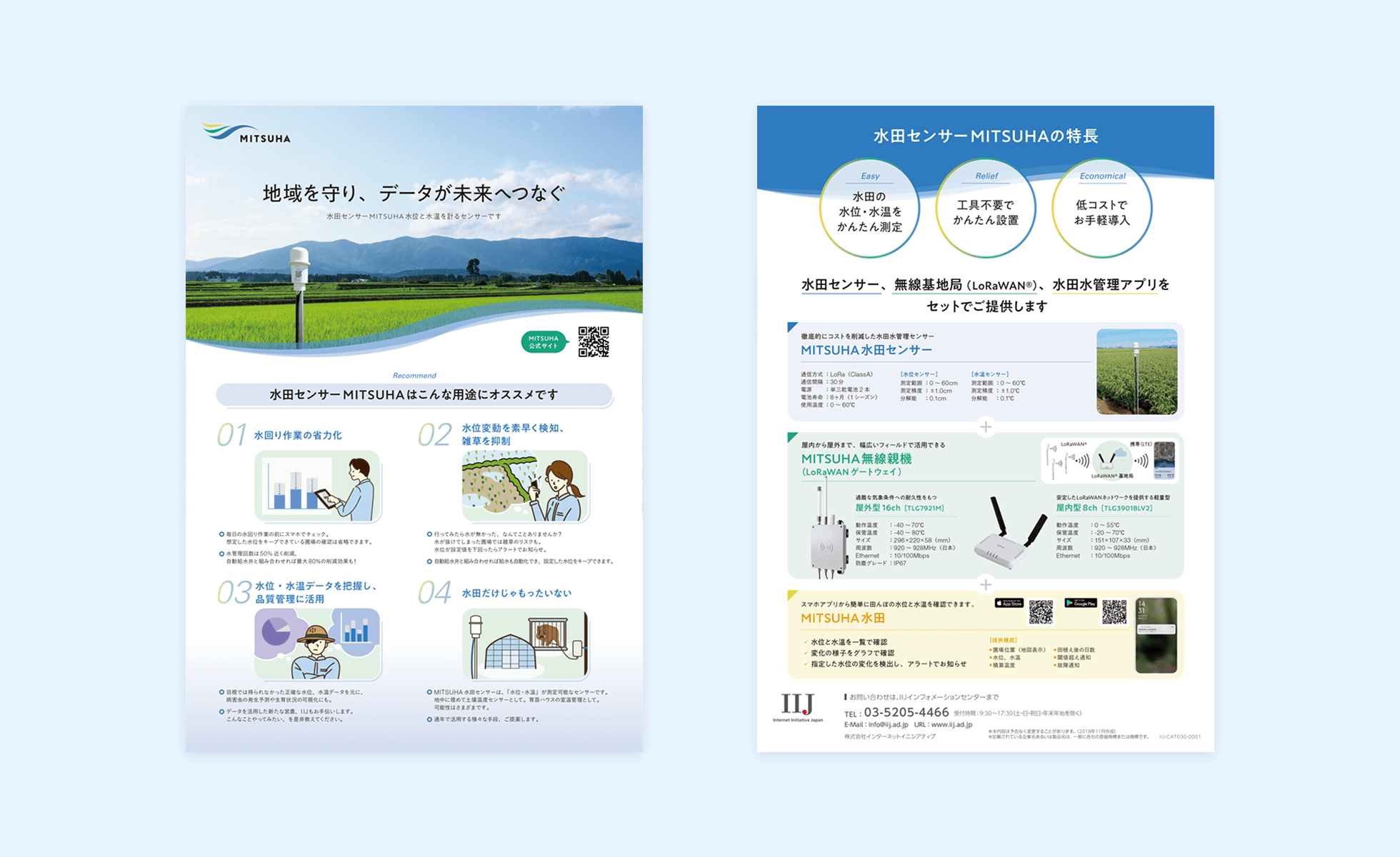 IIJの水管理プラットフォーム MITSUHA のロゴ制作に引き続き、サービスサイトの制作を担当。製品の特長や効果を分かりやすく、理解してもらえるよう挿絵や図版を多用することで、忙しい農家の方々に直感的に認識してもらえるようようにした。A4チラシ、A1パネルも同時に制作。