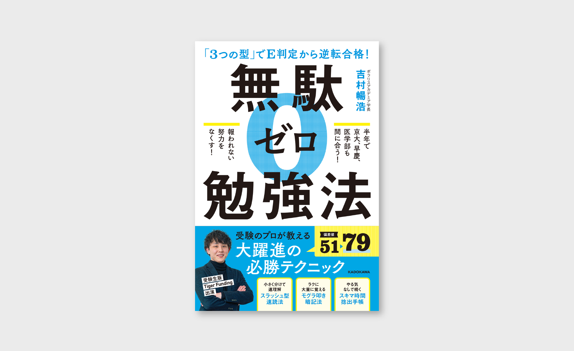 「受験生版Tiger Funding」出演の著者による、「無駄な悩み、頑張りを省く高速学習法」をまとめた一冊。表紙は『無駄ゼロ勉強法』の説得力が視覚的に伝わるような力のあるデザインに。1C印刷の中面は、勉強法のポイントがわかりやすく伝わるように、見出しやまとめのあしらいを工夫し、メリハリのあるデザインに仕上げた。四六判/232P