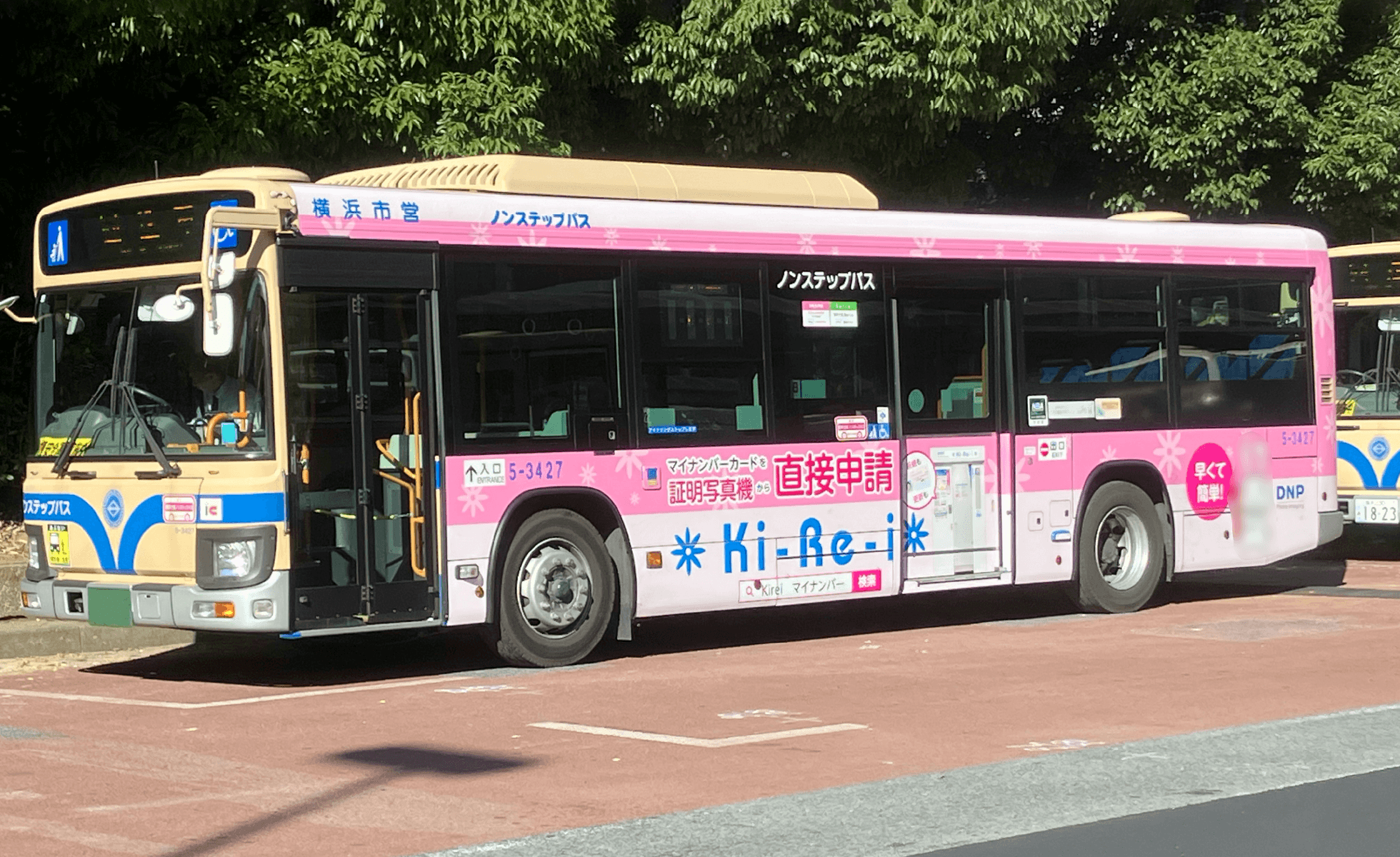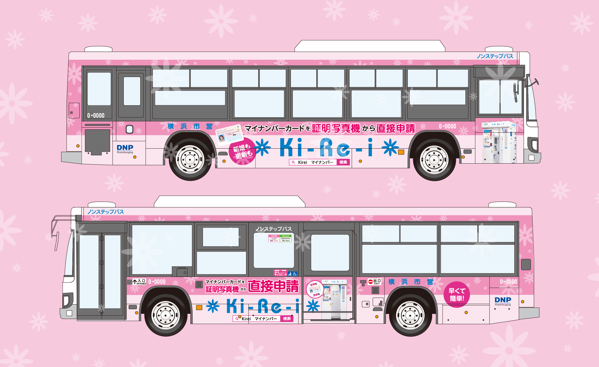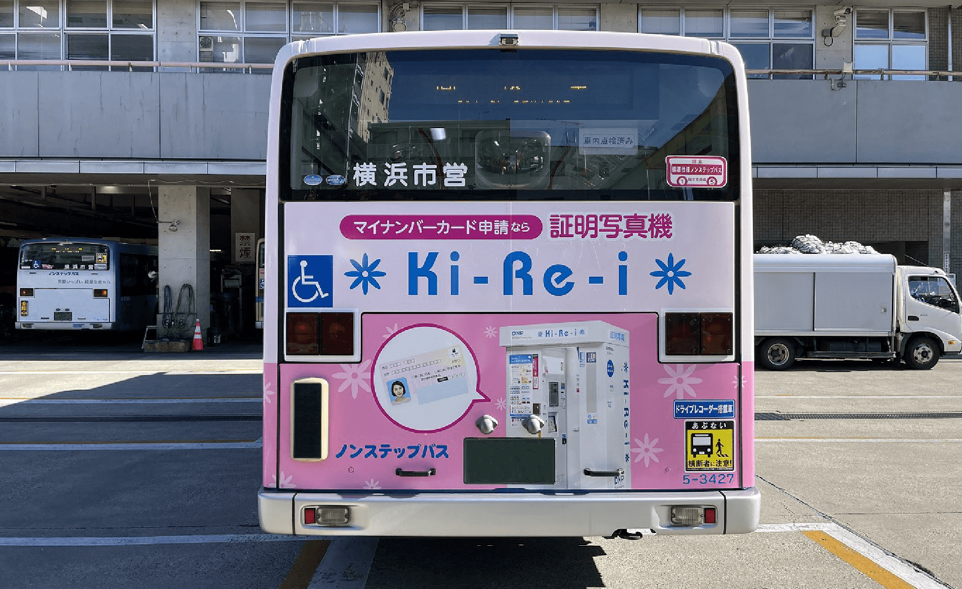 マイナンバーカードの直接申請機能を訴求する証明写真機のバスラッピング広告をデザイン。街を歩く人の目を引く鮮やかなブランドカラーをベースに、伝えたい情報をバランスよく配置した。公共性の高い媒体であることを考慮し、視認性と信頼感の両立を工夫。バスの形状を活かし、どの角度からも視認性が高いレイアウトを実現した。