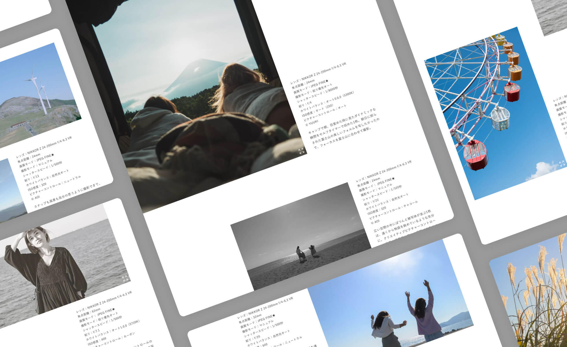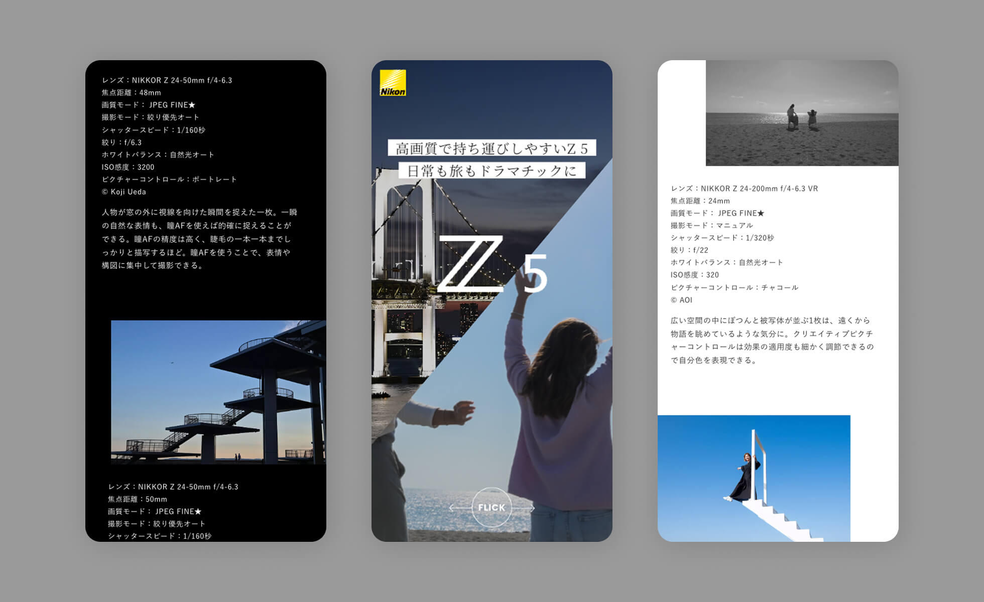 日本を代表する光学機器メーカー ニコン。ミラーレスカメラZ 5モデルで撮った写真のギャラリーページを制作。初心者でも使いやすい手軽さと、本格的なスペックを持ち合わせるZ 5を、「日常」と「旅」という全く異なる2つのシチュエーションで表現。シームレスなページ遷移やニュアンスを意識した動きを採用し、品質の高さや信頼性も表現しながら、2つのギャラリーを直感的に見てもらえるような工夫をした。