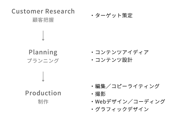 人がサービスやモノを選択するとき、継続的に利用したいと思うとき、そこには間違いなく心躍るカスタマーエクスペリエンス(顧客体験)があります。digでは、お客様の顧客接点におけるカスタマーエクスペリエンスの価値向上のために、プランニングやコンテンツ制作を行っています。また、プロジェクト完了後も継続的な価値を提供するため、サポートチームが運用/効果検証を行います。